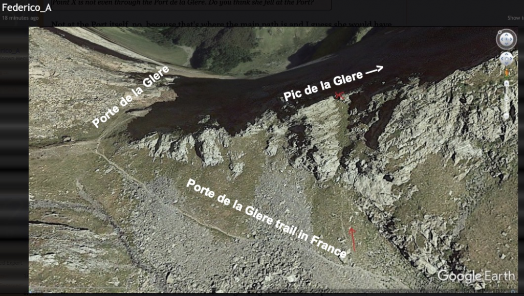 Not at the Port itself, no, because that's where the main path is and I guess she would have been easily found around there. X is higher up to the east (100m higher at a very rough guess). That point is not visible from the Port on the Spanish side as it's round a bend and behind several rocky outcrops.Point X is not even through the Port de la Glere. Do you think she fell at the Port?