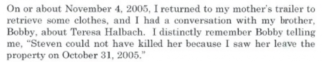 ok wait... I'm confused lol Since you think SA is guilty, this statement actually looks bad for Bobby or good for SA, doesn't it? That was on the 3rd, why did Bobby assume she was dead? I can understand why they were discussing it, that was the night that Colborn showed up around 6:30pm... and around 7pm is when Steve and Chuck went to Menards. I wonder around what time Bobby would have said that to Bryan?