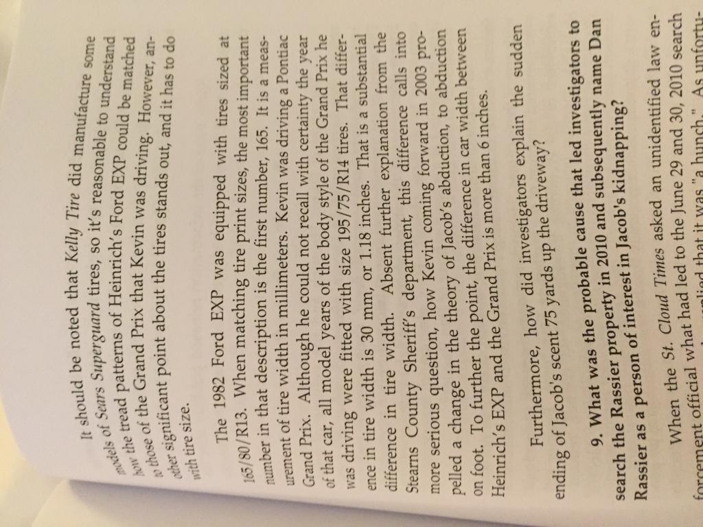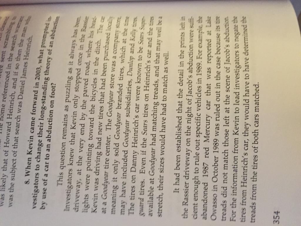 I didn't see anything on the pages regarding "lack of footprints"....but maybe that will be forthcoming or I missed it. So there's 2 sets of tire tracks, somewhat possibly similar but yet physically + specifically discordant. The interesting thing is LE discounted Heinrich's tire tracks not once-but twice(1989 + 2003). Kevin's tire tracks were a conundrum until he(Kevin) came forward. If Heinrich's tire tracks were discounted, then that means LE was following Kevin's tracks for years. And when Kevin came forward, then the logical conclusion is abduction by perp on foot. There must be something else compelling on that driveway to explain this perplexion.......or not?