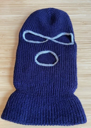 To me, this ski mask has a 1970s- 1980s vintage vibe. I say this only because of the lighter, contrasting yarn color outlining the eye and mouth openings. I could be completely wrong on this, but I haven't been able to find SOLID COLOR masks that have the contrasting color outlining feature in newly made ski masks. One exception I found is the Line brand ski mask in black. However, the Line logo would have to be hidden in some way to not be visible in the perp footage.