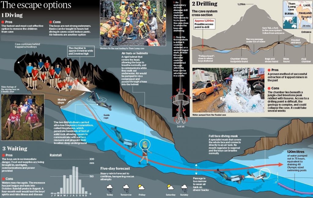 This is good news, but is also just a temporary reprieve. Monsoon rains are due to arrive at any moment and when they do there are fears that any rescue attempt involving the boys diving out of the caves will become impossible and that the desperate attempts to reduce water levels to make a rescue operation safer will have been in vain."