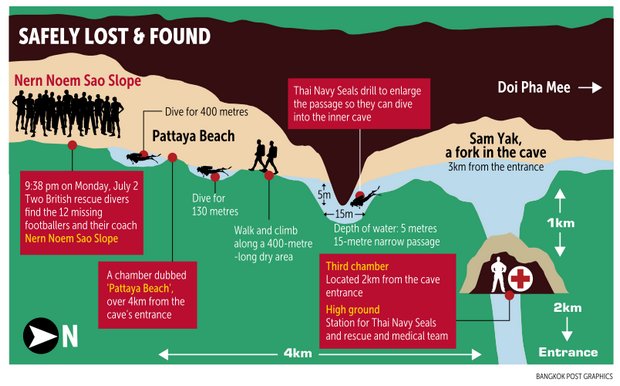 Here is another graphic showing where some of the air pockets/dry areas are located and where the narrow passage is. Although I believe the "4km" distance shown at the bottom is incorrect - I've seen 2km in other articles. Anyway ...