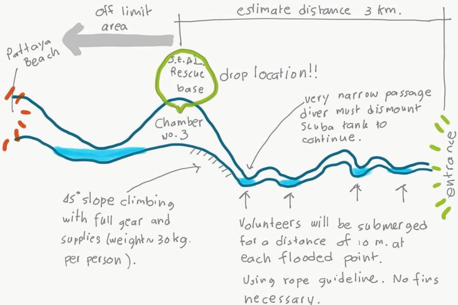 "The navy source said the biggest challenge for the boys would be a 200-metre stretch of completely flooded cave that makes up part of the 600-metre section between so-called "Pattaya Beach" and Chamber Three, where an operation centre has been set up.
