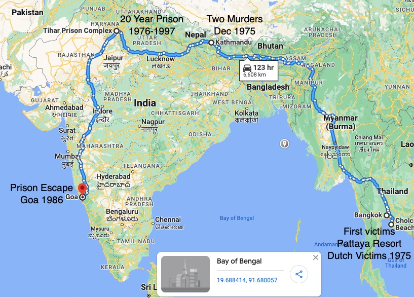 In 2004, he returned to Nepal, where in Dec 1975 he robbed Connie Jo Bronzich (USA) and Lawrence Carrier (CAN) before burning their bodies. He was quickly detained in 1975, but avoided arrest by posing as his Dutch murder victim. He might have believed that the statute of limitation for murder had expired in Nepal, or perhaps he thought he could talk his way out of murder charges based on his false passport use. He avoided the firing squad in Thailand, but he spent another 20 years in prison for the Nepal murders. He is 78 years old. A timeline of his life and people who disappeared in those areas would be interesting.