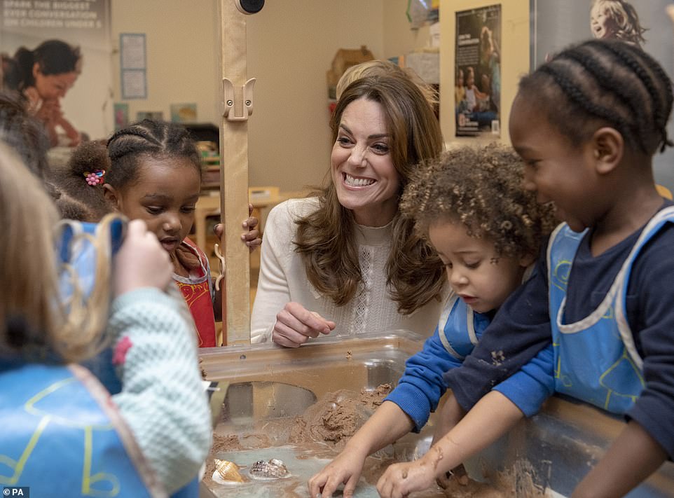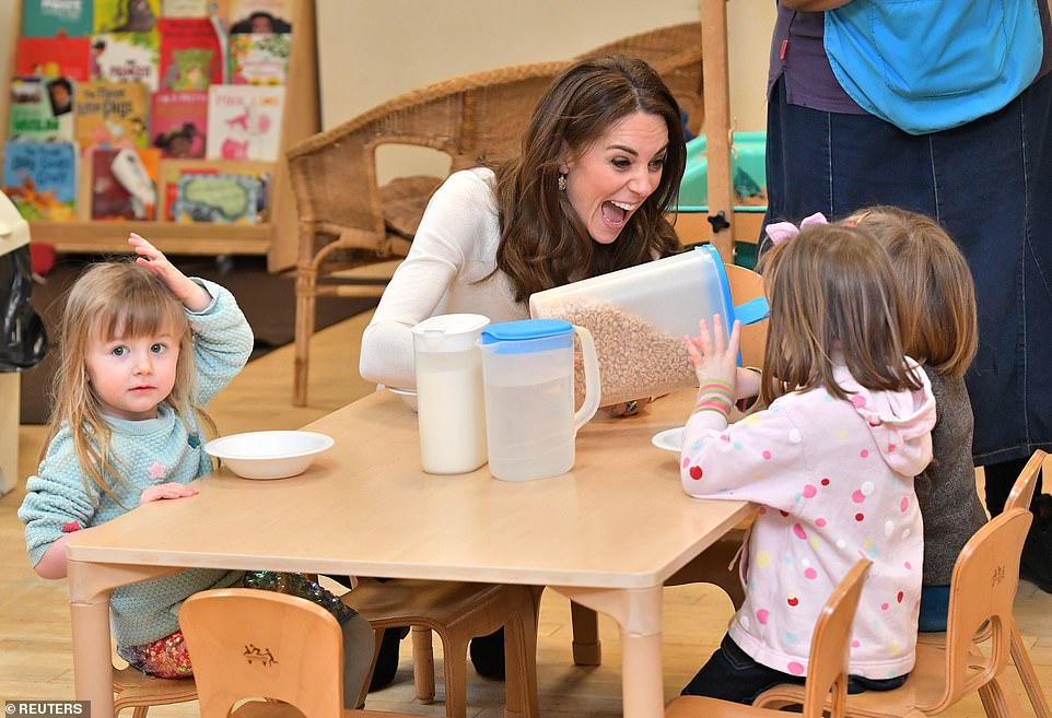 Breakfast with the Duchess! Kate Middleton dons skinny jeans as she gets stuck into the morning routine by serving cereal and playing games on a nursery visit to discuss her early years development survey