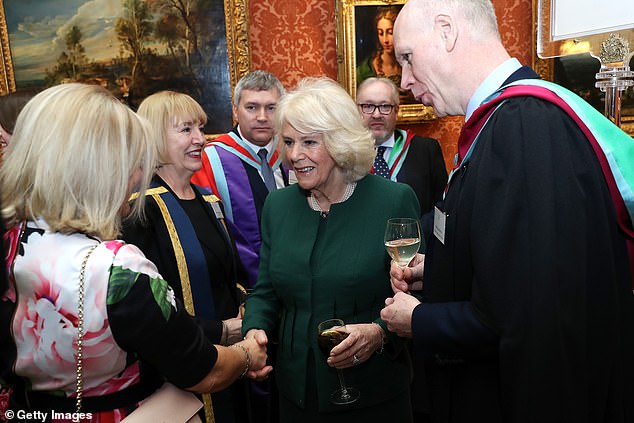 Duchess of Cornwall looks elegant in her favourite forest green as she joins Prince Charles to present the Queen's Anniversary Prizes at Buckingham Palace