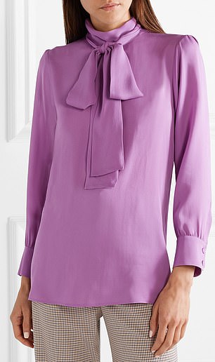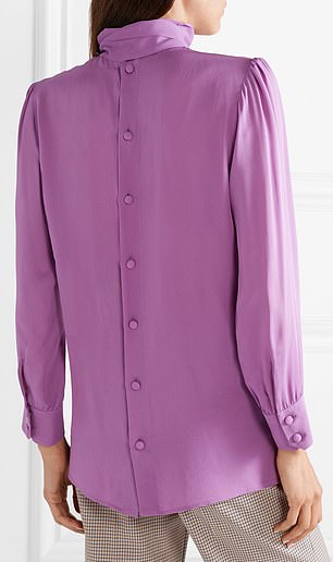 The purple silk-crepe pussy-bow shirt has a row of small buttons down the back, according to Net-a-Porter. But Kate noticeably put hers on with the buttons at the front.