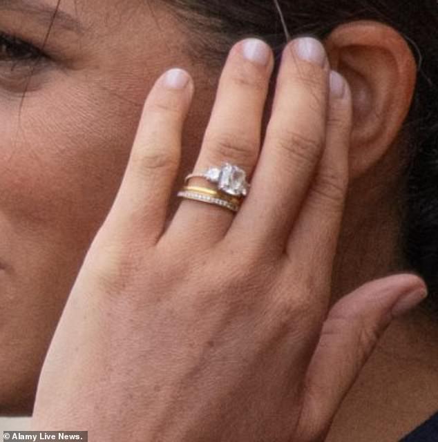 Has Meghan redesigned her engagement ring? Eagle-eyed royal watchers spot that the Duchess' glittering trio of diamonds are set on a thinner band than the one Harry chose