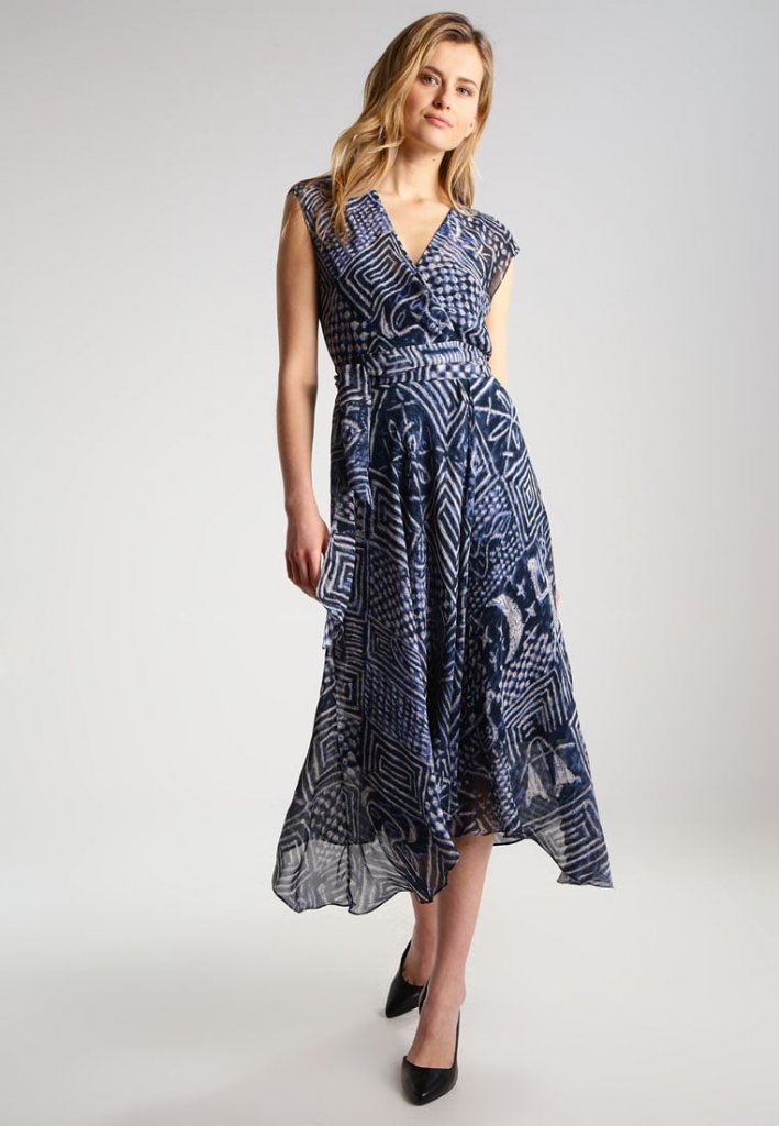 Personally I don’t like that skirt at all. It’s georgette, which means it’s light and delicate-looking. Pairing it with a standard white cotton shirt looks like a color and fabric mismatch. It might be saved with a matching blue or black blouse. But overall, it’s a non- starter for me.