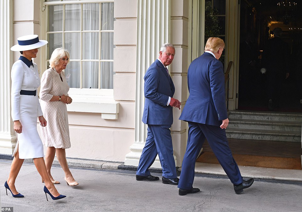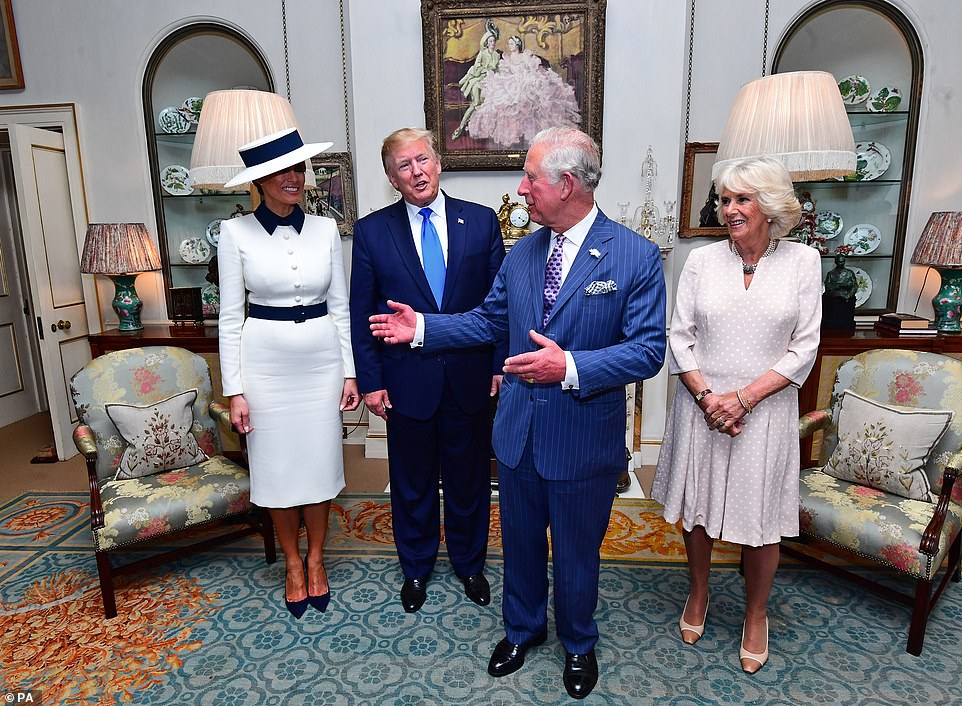 Time for afternoon tea with Charles! President Trump and Melania are welcomed to Clarence House after spectacular reception at Buckingham Palace including a 21-gun salute and lunch with the Queen