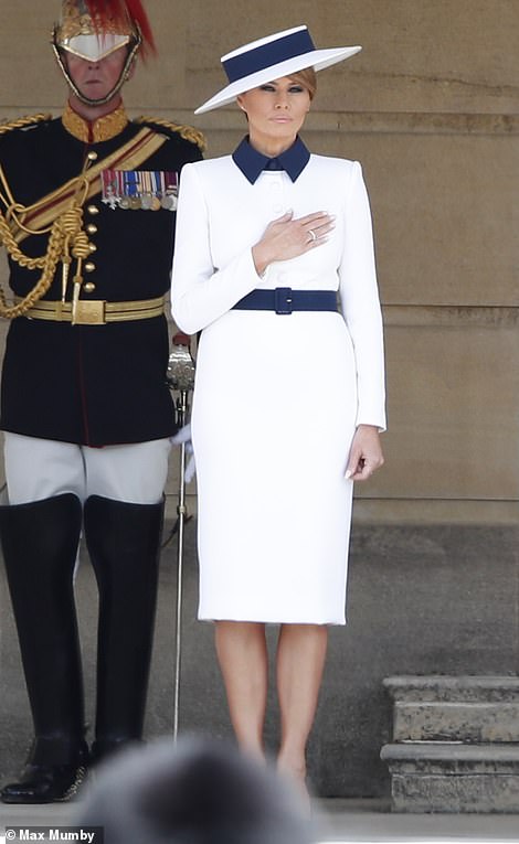 Melania's My Fair Lady moment! Elegant Mrs Trump channels Audrey Hepburn in a white and navy ensemble as she arrives at Buckingham Palace