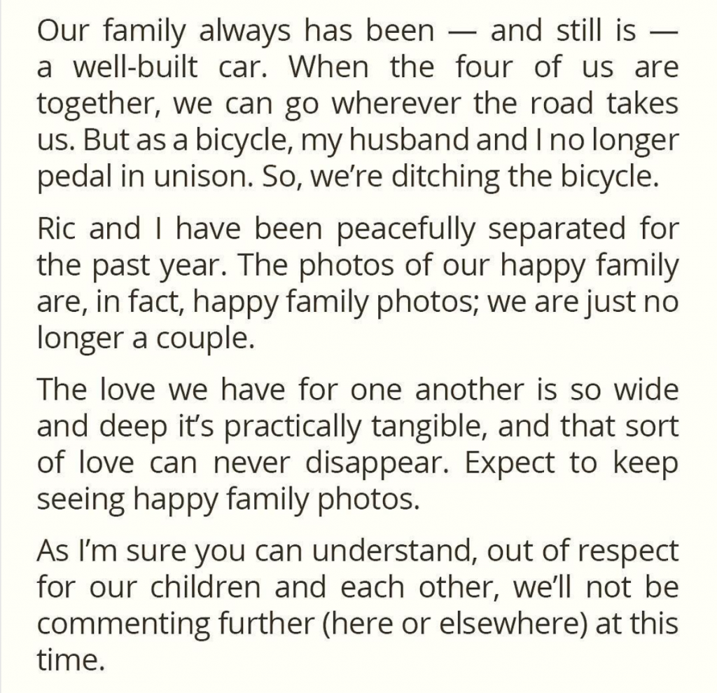 The Czech-born actress also revealed that the couple had already been split for quite some time, adding, “Ric and I have been peacefully separated for the past year. The photos of our happy family are, in fact, happy family photos; we are just no longer a couple.”