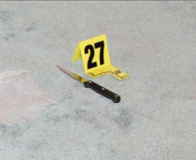 The steak knife was found in the bedroom along with most of the other evidence. It is not new evidence - it was known to Sheriff investigators and also that there was blood on it...although "covered" with blood is new. It is obvious from looking at this photo the handle is not "covered" in blood.