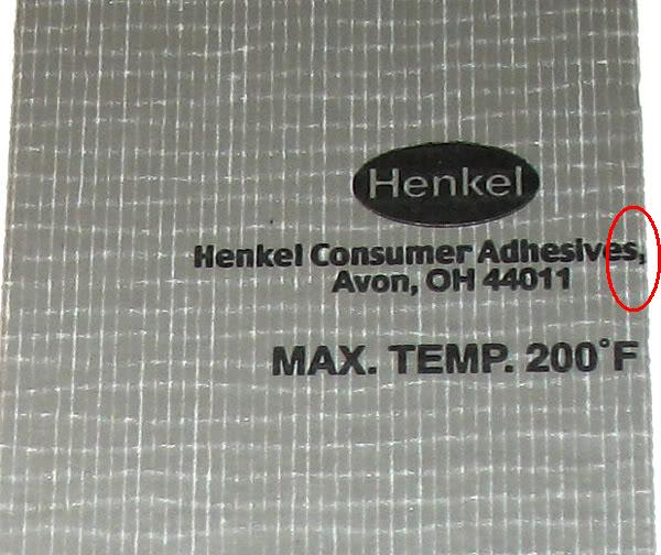 Remember when we did the duct tape survey and one person - FairNBalanced - managed to find a roll of the rare tape? Here is one of the images posted, with an annotation by me showing that the logo lettering is cut on the right edge of the tape just after the comma: