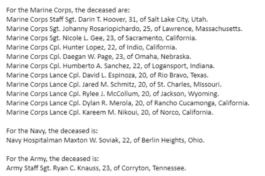 Killed were Navy corpsman Max Soviak, Army Staff Sergeant Ryan Knauss, and Marines Hunter Lopez, Rylee McCollum, David Lee Espinoza, Kareem Nikoui, Jared Schmitz, Daegan Page, Taylor Hoover, Humberto Sanchez, Johanny Rosario, Dylan Merola and Nicole Gee.