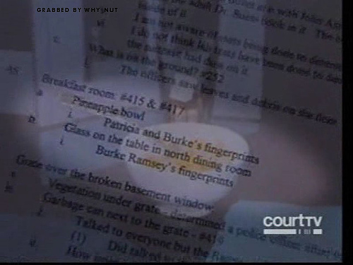 Plus, although the Ramseys deny knowing anything about jbr eating pineapple or how pineapple came to be in that bowl, no one denies that pineapple was in the house (Mrs Ramsey bought it at Safeway, pre-cut).