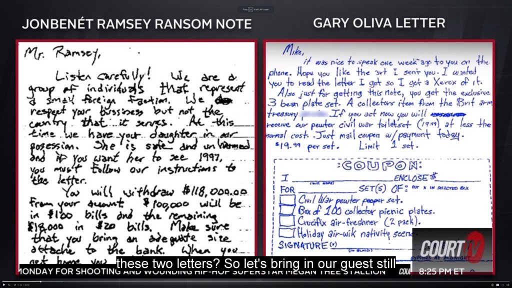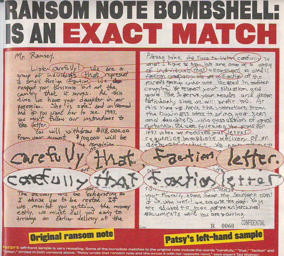 It is wrong to declare Patsy wrote the RNote based mostly upon the letter q. It's just as likely that someone studied her writing or had seen it on copious occasions so practicing a few key letters wouldn't be that difficult to replicate. Hence, the RN is a forgery of Patsy's writings. jmoo I'm not an expert.