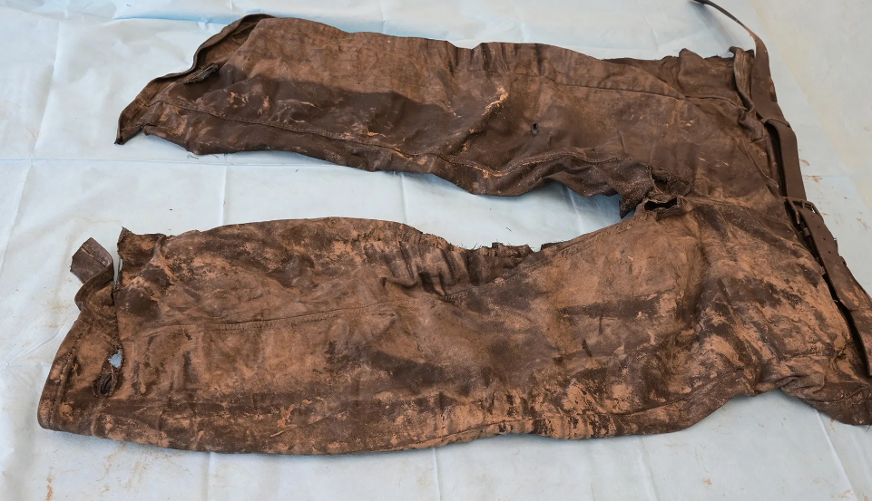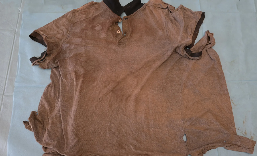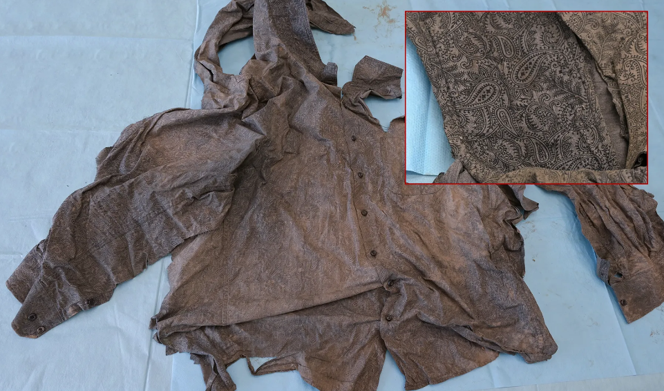Please look closely at the clothes the deceased was wearing. These are a shirt with a collar, over it a paisley patterned blouse and over it a vest in size M of the BLUE brand.