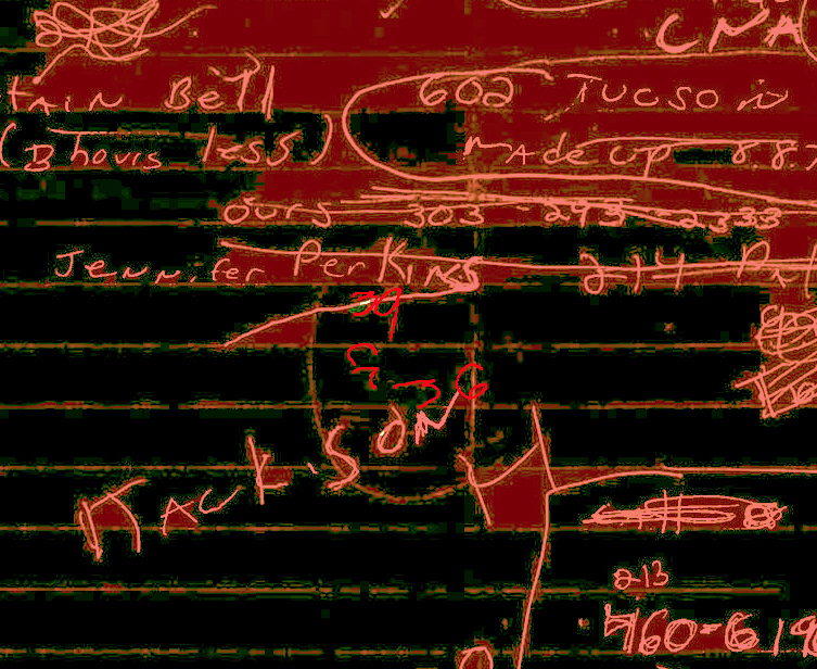 Upon further infrared enhancement and conversion, I can determine that underneath the name "Jennifer Perkins" and within the semicircle line is the number "39," and the letters "CA" followed by the number "36" underneath. It's possible that the last number could be B6 instead, but after doing a trace scan, it's a closer match to 36. (see last image for comparison in red lettering).