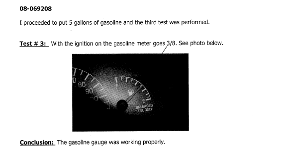 KC claimed to friends that the gauge was broken. However, CSI Bloise tested the gauge in the forensics garage and found it to be working just fine (discovery page 3213).