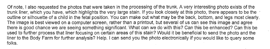 On page 8407 (http://www.clickorlando.com/download...9/21146773.pdf) FBI agent Cowan describes the stain in the trunk as looking like the image of a child in the fetal position. :shakehead: