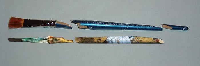 Two broken paintbrushes may indicate a second person was present at the crime scene. In the execution of their plan and under duress, each person, unbeknownst to each other, grabbed a paint brush and broke it, only to realize at some point they had two.