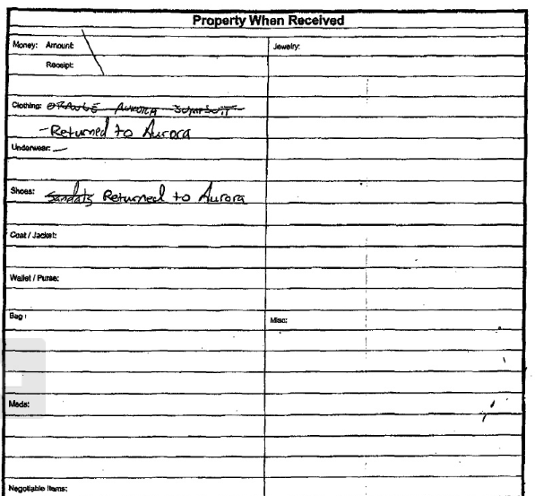 Page 2 of Booking Report. What the heck was he wearing? He had no meds/money? Huh? Is this saying that Aurora City Police had him first and then Arapahoe County returned items to the City?