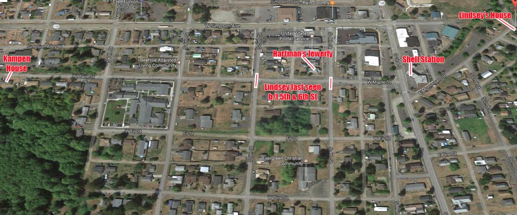 A wide-ranging search was launched early Saturday in the town and the surrounding forests. The town was criss-crossed three times, but not a trace of Lindsey has been found. Even bloodhounds failed to pick up her scent. "We searched all of the outlying area of the logging roads... and up the highway, and along the railroad tracks," said volunteer Stephanie Ross. Pimentel said it's strange that nobody saw anything unusual.