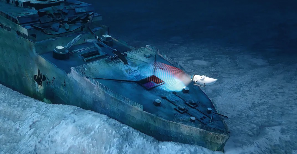 A rendering of OceanGate’s Titan submersible exploring the deck of the Titanic. OceanGate