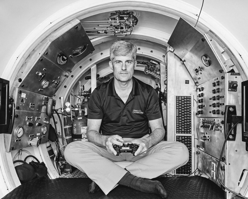Blackandwhite photograph of Stockton Rush inside a submersible holding a game controller.