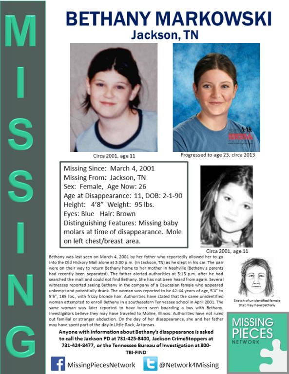 Bethany Markowski was last seen by her father in the parking lot of the Old Hickory Shopping Mall in Jackson, Tennessee, on the afternoon of March 4, 2001. Bethany had gone into the mall alone while her father waited for her in the car. After approximately two hours passed, Bethany's father went into the mall to look for his daughter, but was unable to locate her.