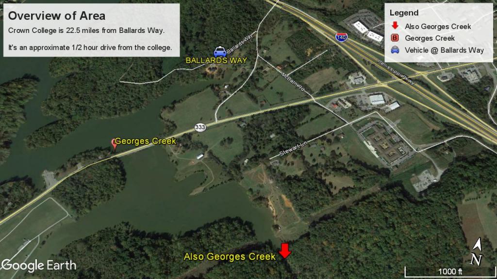 There are two places called Georges Creek. One is up next to where the bridge connects across the water source. That may be where some confusion is coming in. I think he was found at the "B" Georges Creek, bridge location. Just a hunch.