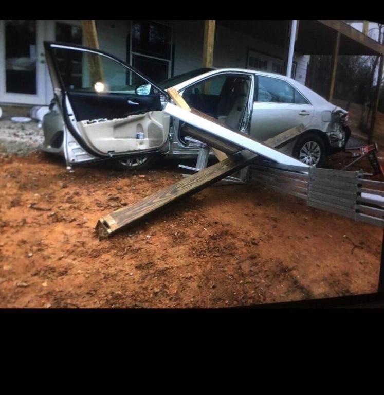 if you look at a close up of the houseu can see theres a stairway support missing. the rear end took that out hence the door not damaged till the second post. u can see where the post slid down the interior of the door as it forced it backwards against the wing of the car. the lighter coloured wood damaged the interior door trim in line with the door mirror. if u zoom in on the wood it appears where the long beam and another cross there is white residue from the interior door trim and by the joint cutting in the end of the wood its the right face of the wood.the white thing is the fall pipe attached to the deck support.