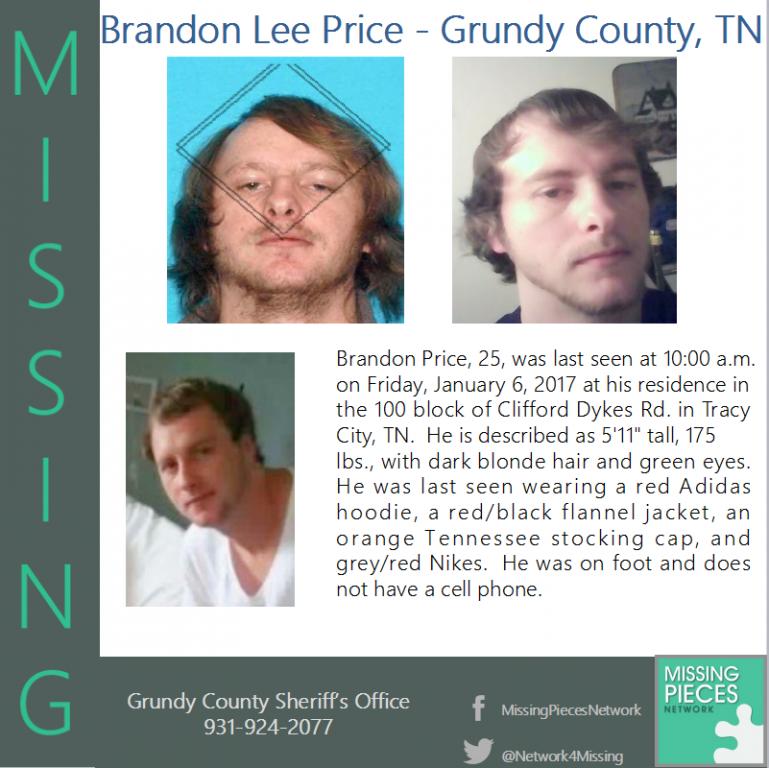 http://www.timesfreepress.com/news/...help-searching-missing-tracy-city-man/406756/According to the Grundy County Sheriff's Office, 25-year-old Brandon Lee Price was last seen at his home south of Tracy City around 10 a.m. Friday wearing a red Adidas hoodie, a flannel undershirt with a gray hood, black jeans and white tennis shoes.