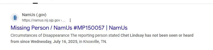 Circumstances of DisappearanceThe reporting person stated Chet Lindsay has not been seen or heard from since Wednesday, July 16, 2025, in Knoxville, TN.