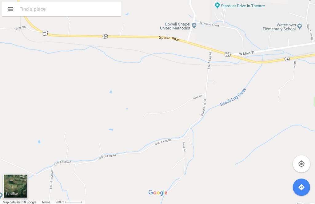 Beechlog Road runs to the east of the property with smaller lots separating it from the property where David was. Would be very easy to get on Route 70/ Sparta Pike and onto Beechlog to get to the property where David was found. The property he was found on is just to the left of where Beechlog ties into Route 70/ Sparta Pike. The train tracks are the grey line running near Route 70/ Sparta Pike and Beechlog crosses the train tracks.