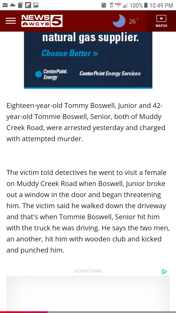 “Tommy Boswell, Jr., 18, of 543 Muddy Creek Road and Tommie Boswell, Sr., 42, same address, were arrested and charged with attempted murder after an investigation by the Sullivan County Sheriff’s Department.
