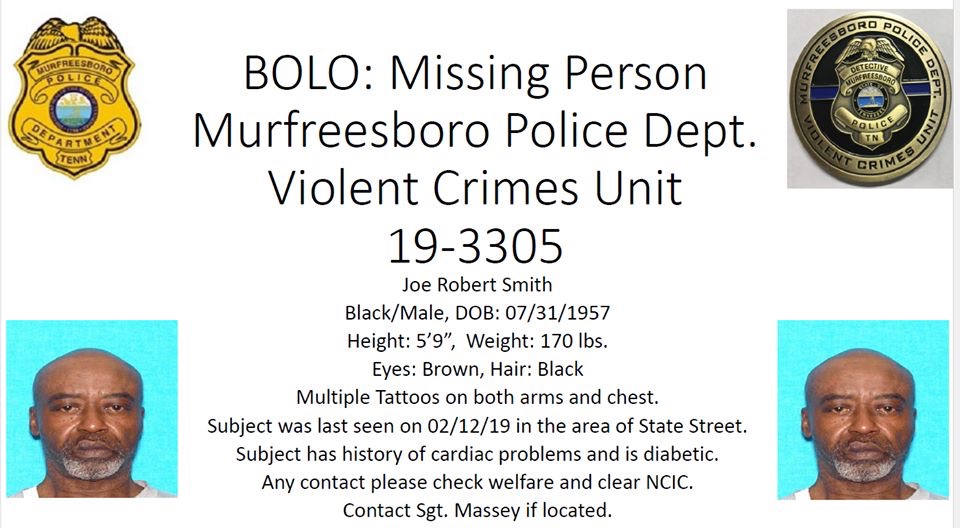 MISSING/ENDANGERED PERSON: Murfreesboro Police Violent Crimes Unit urges people to be on the lookout for Joe Robert Smith, 61. He has a history of cardiac problems and is diabetic. Call (615) 893-1311 if you see him.