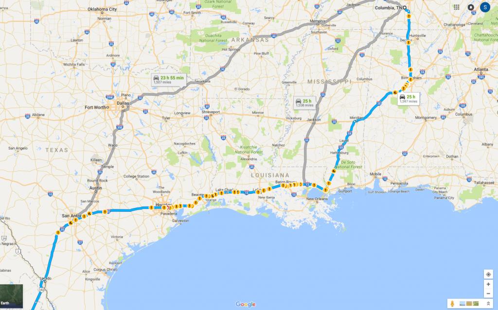 My guess is Tad hadn't tried to, say, drive to Mexico lots of times previously, so he'd still be relying on the same tools you and I would. He'd probably Google Map it. Google Map offers 3 routes from Columbia, TN to Mexico when just trying to get to the border in the fastest way (24 to 25 hour drive). Only one of the routes goes through Decatur. I am pasting that one below. Click on it to enlarge it.