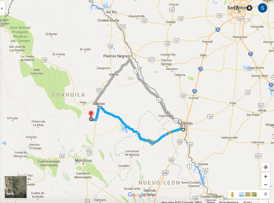 Using the route in the quoted comment above, which goes from Columbia (their hometown) through Decatur (where their phones pinged) to the Laredo, TX border crossing, here is what I see: