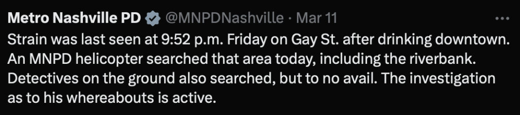 Snipped by me: "... LE in Nashville ... are doing all they can. No amount of searching will be enough for a family who is desperate to find their child -- nor should it be! The more hands on deck, the better. ..."