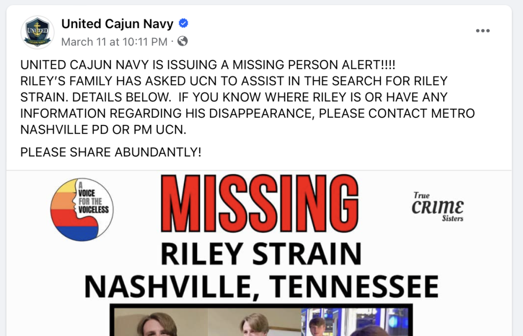 The parents of missing college student Riley Strain are asking the Cajun Navy — which usually helps out in natural disasters — for help finding their son in Nashville.