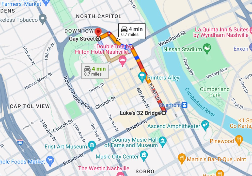 He was at a different part of Gay Street than that shown on your map. He was at the part right next to the river near the Woodland St. bridge.It’s striking what a quick 10 minute walk he had between bar and hotel, and then how staggeringly in the opposite direction he wound up.