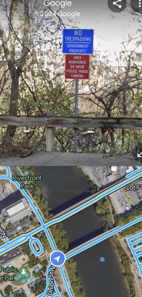 He might've gotten turned around, it's very easy to do in the city. I have family that lives in the city and they have my whole life so I have spent a good amount of time there. All along the river and where the park is in the city there is a fence that lines the cliff to the water, there are gates along the way under the woodland bridge and the other 41 bridge about a block away. There are signs stating "24 hour police surveillance and prohibited" because it was a terribly shady place years and years ago even when the park was there. I wonder if the signs are true.