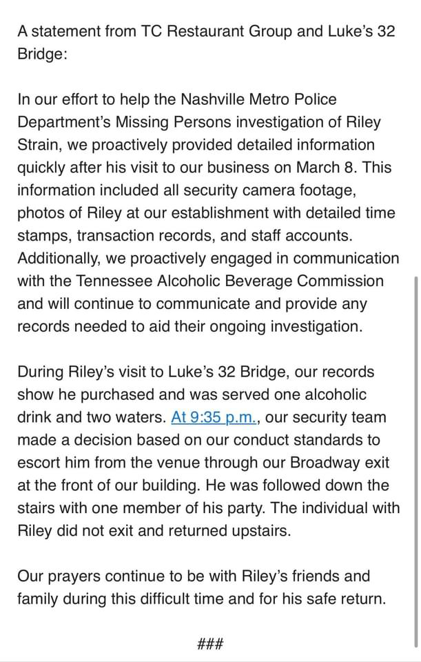 TC Restaurant Group released a statement, giving more details into what happened at Luke Bryan’s bar the night Riley Strain disappeared. They say he was given one drink and then escorted out the Broadway entrance.