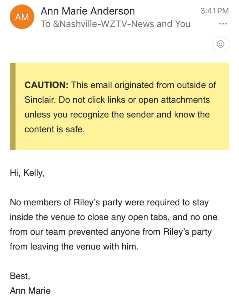 Update: The restaurant group that owns Luke Bryan’s bar replied to my inquiry, and says that no one from Riley’s group was required to stay to pay a tab, or prevented from leaving with Riley. I will check again with Riley’s fraternity brothers. Many of you online were asking about this, bar protocol, etc., so I went ahead and inquired.