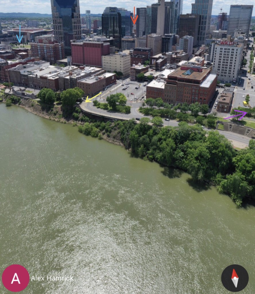 For perspective, I found two Google Earth Photo Spheres taken from above the river at different angles of downtown. I added arrows depicting general locations of the key areas. The two bridges are just outside of the image on the right.