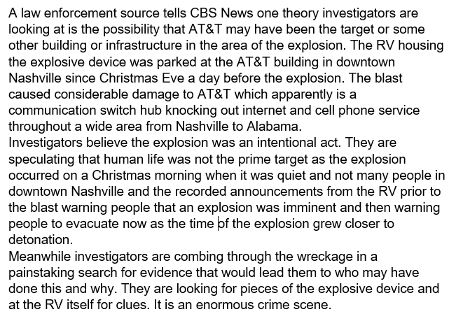 Very true. This is such a weird one though. The timing of Christmas morning reduced casualties and also reduced the amount of attention. I didn’t even know about the bombing until late yesterday because I was busy with Christmas. I bet most of America wasn’t really paying attention to this until last night or today. Why do something so massive when everyone’s attention is elsewhere and also not send any clear message about who did it or why? Just strange.