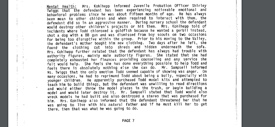 IMO, it was the mother's responsibility to call law enforcement or call emergency therapy if he's threatening her, and she certainly didn't do anyone any favors by attempting to marginalize it with the judge, am I right here, she went on to claim he walked the raped girl home?? I mean, she is kind of all over the place. If he's hurting animals, sending other people's kids down the streets, that implies quite a lack of acknowledgement or tactlessness on her part. As a parent of a child, I could hardly be so at ease with anyone abandoning a child they brought into the world, and leave for the rest of us to somehow handle... how did anyone think that we could be any more prepared?? Another reason I am not so sure about Todd's supposedly harm-free upbringing/largely due to genetics profile... again that's just me personally. I've seen too many of these cases start off with physically violent claims later confirmed by a more proper research on the upbringing...