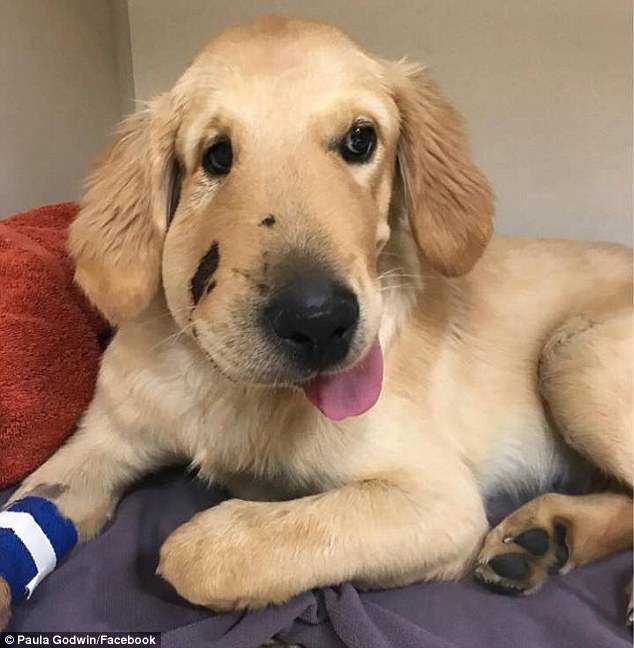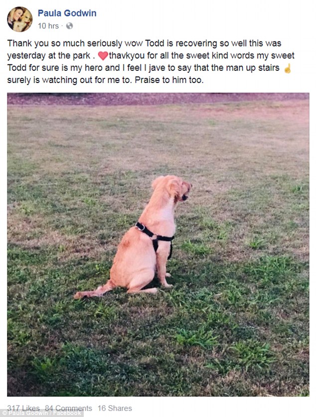 Goodwin posted photos of the recovering retriever on her Facebook with the caption: 'My hero of a puppy Todd saved me.'